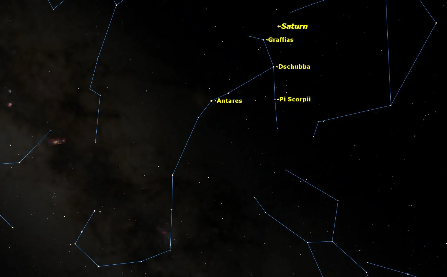 Saturn is just north of Scorpius’ “claws.” At opposition on May 22, it is visible all night.